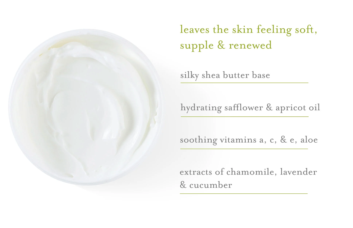 a silky shea butter base blended with safflower oil, apricot oil, antioxidant vitamins and botanicals extracts. leaves the skin feeling soft, supple and renewed.
