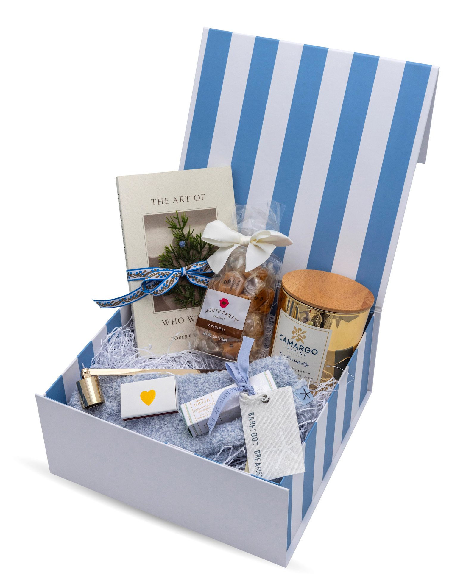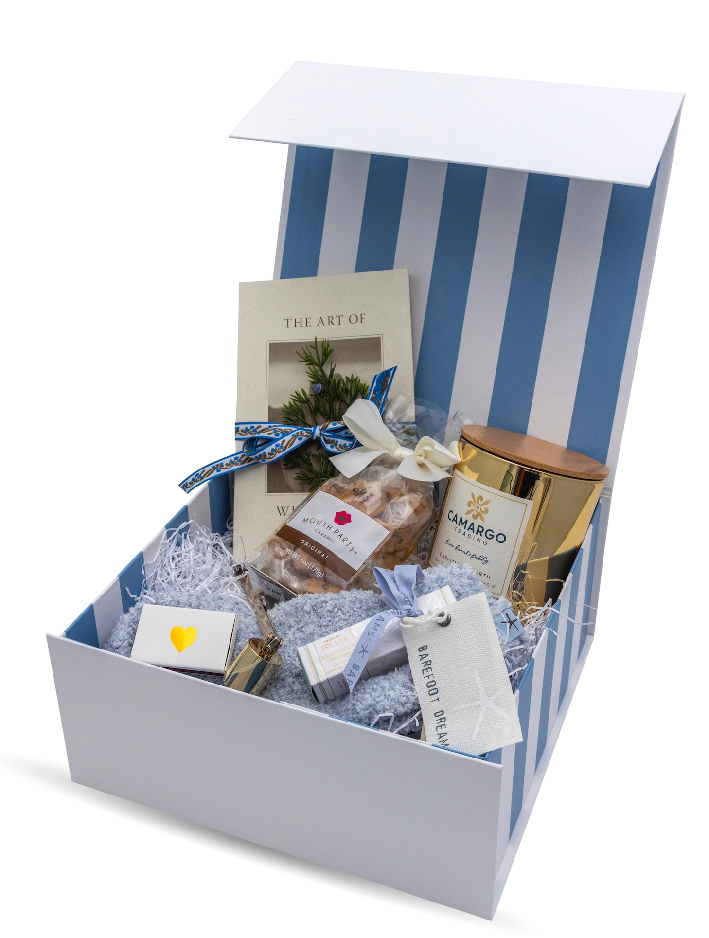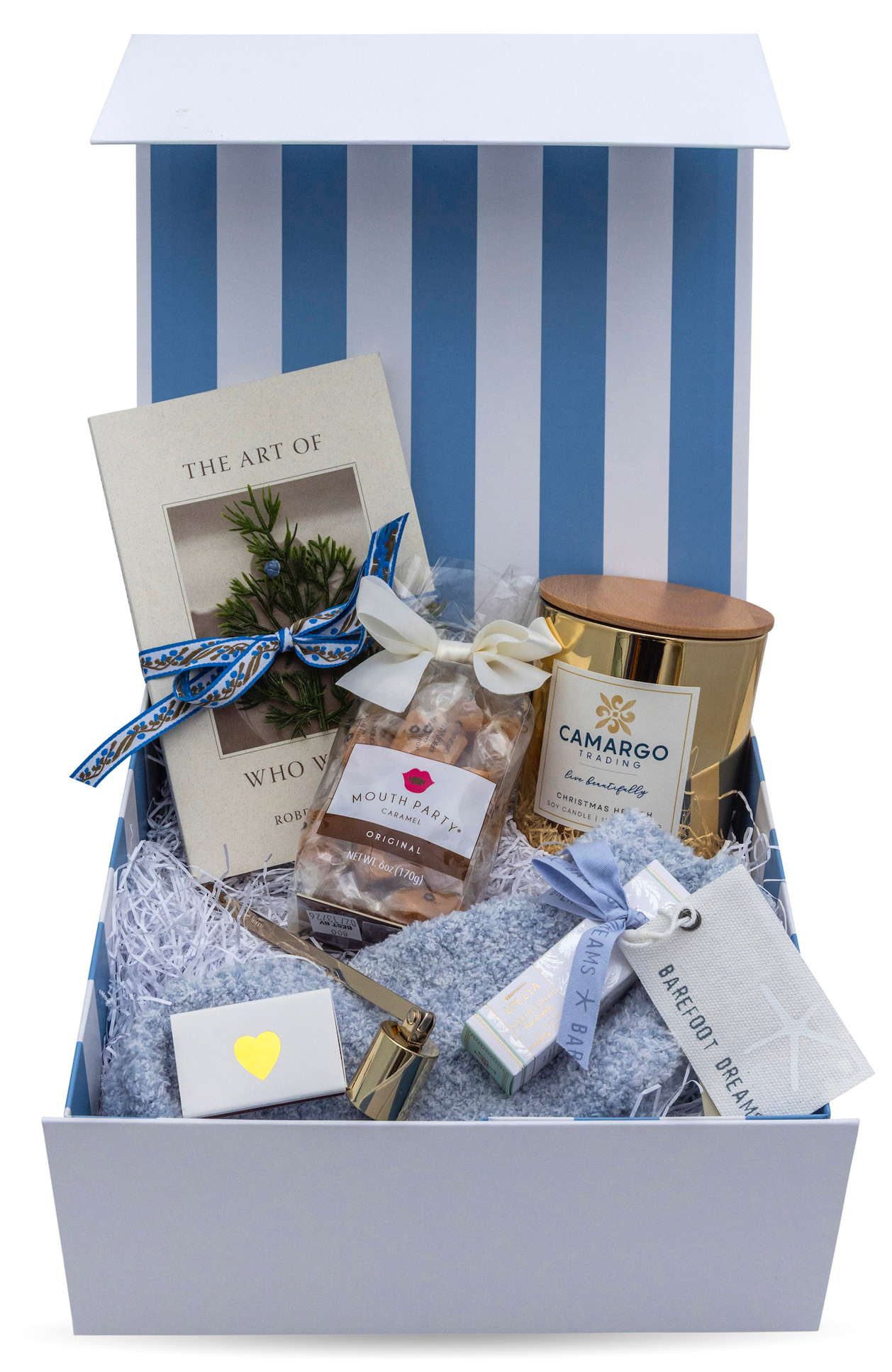 Exclusively curated Camargo Trading gift box. Each box includes a pair of Barefoot Dreams cozy socks, The Art of Who We Are book, Camargo Trading Signature Christmas Hearth candle, Set of matches, Candle snuffer, Mouth Party gift bag, and Snowdrop petite hand cream