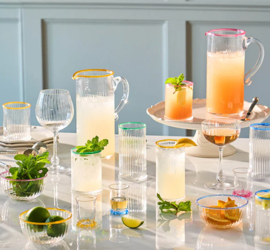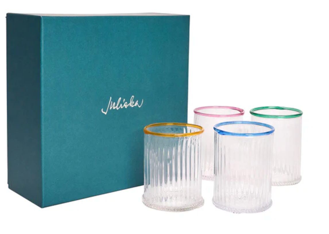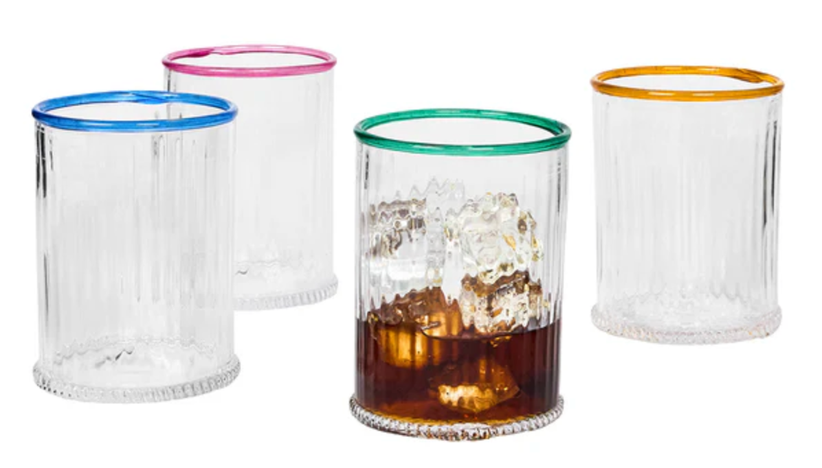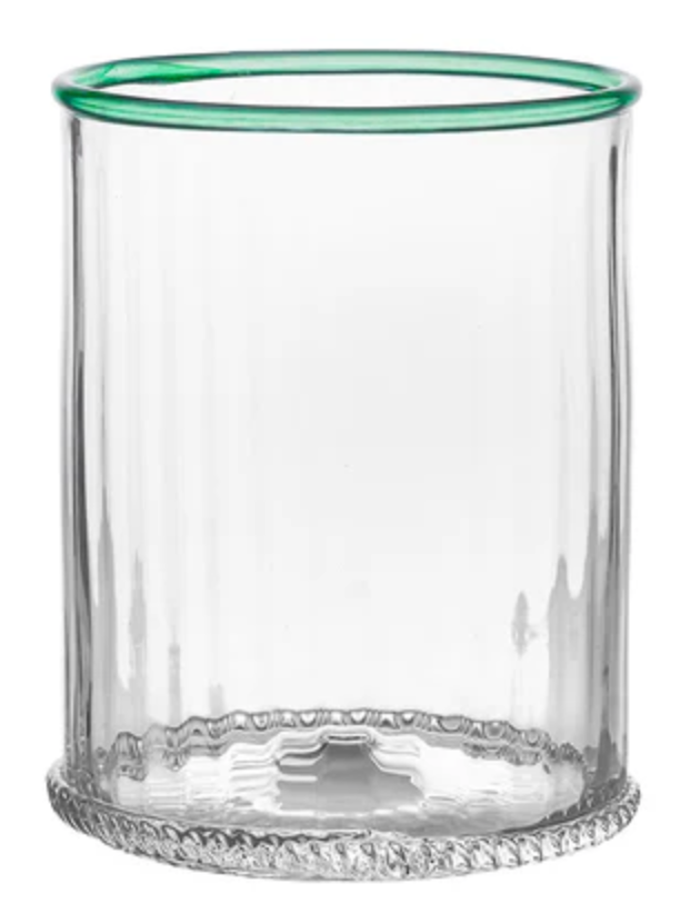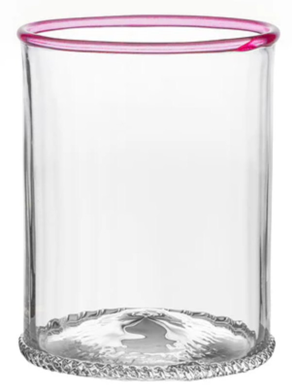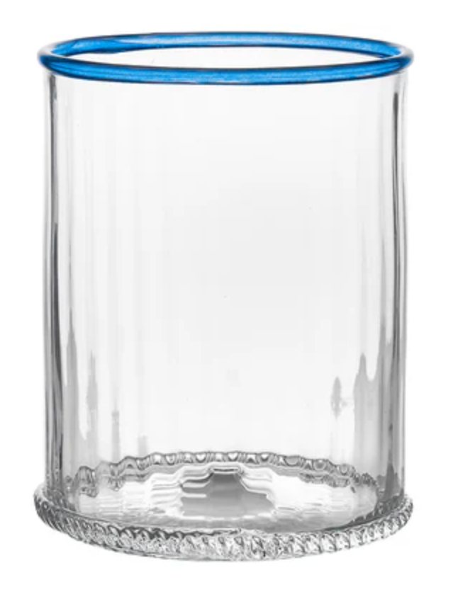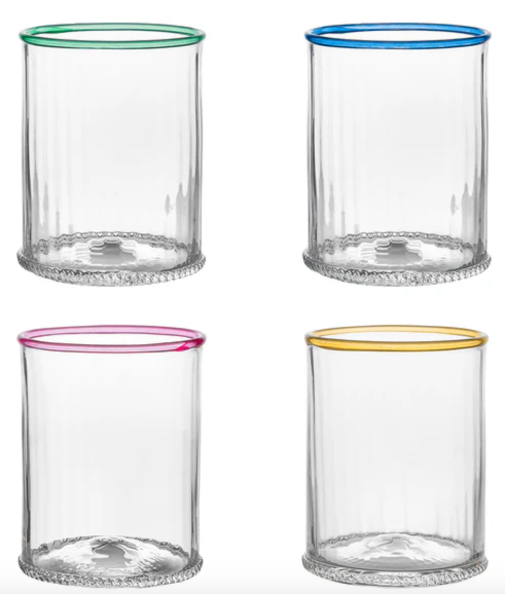 Our iconic Bohemian Glass is given a fresh and modern spin with a joyful wink of color. Chic and shimmering, each Double Old Fashioned ripples with intricate mouth blown glass and is rimmed with a happy hue to create pure cocktail-hour eye candy for everything from water to whisky. This set includes one of each color. Gift boxed.