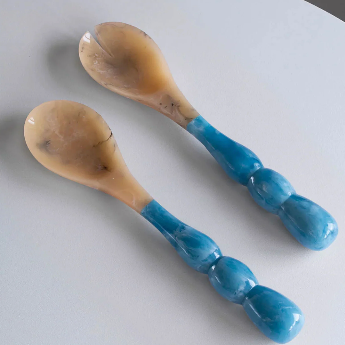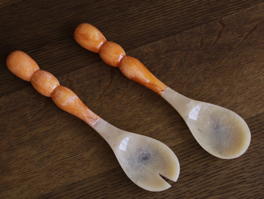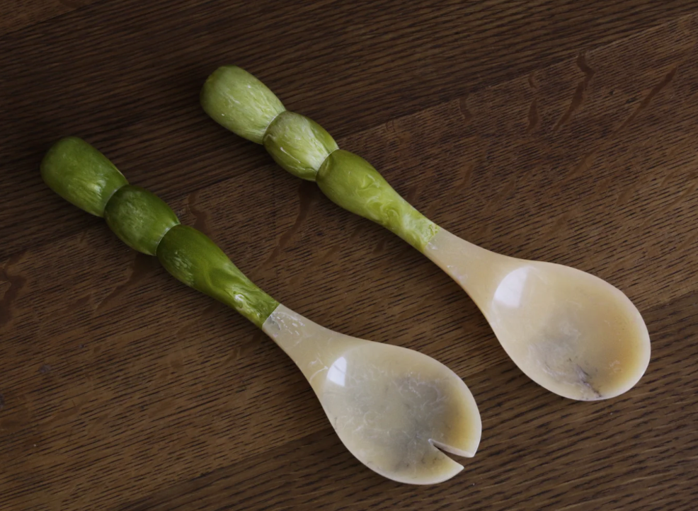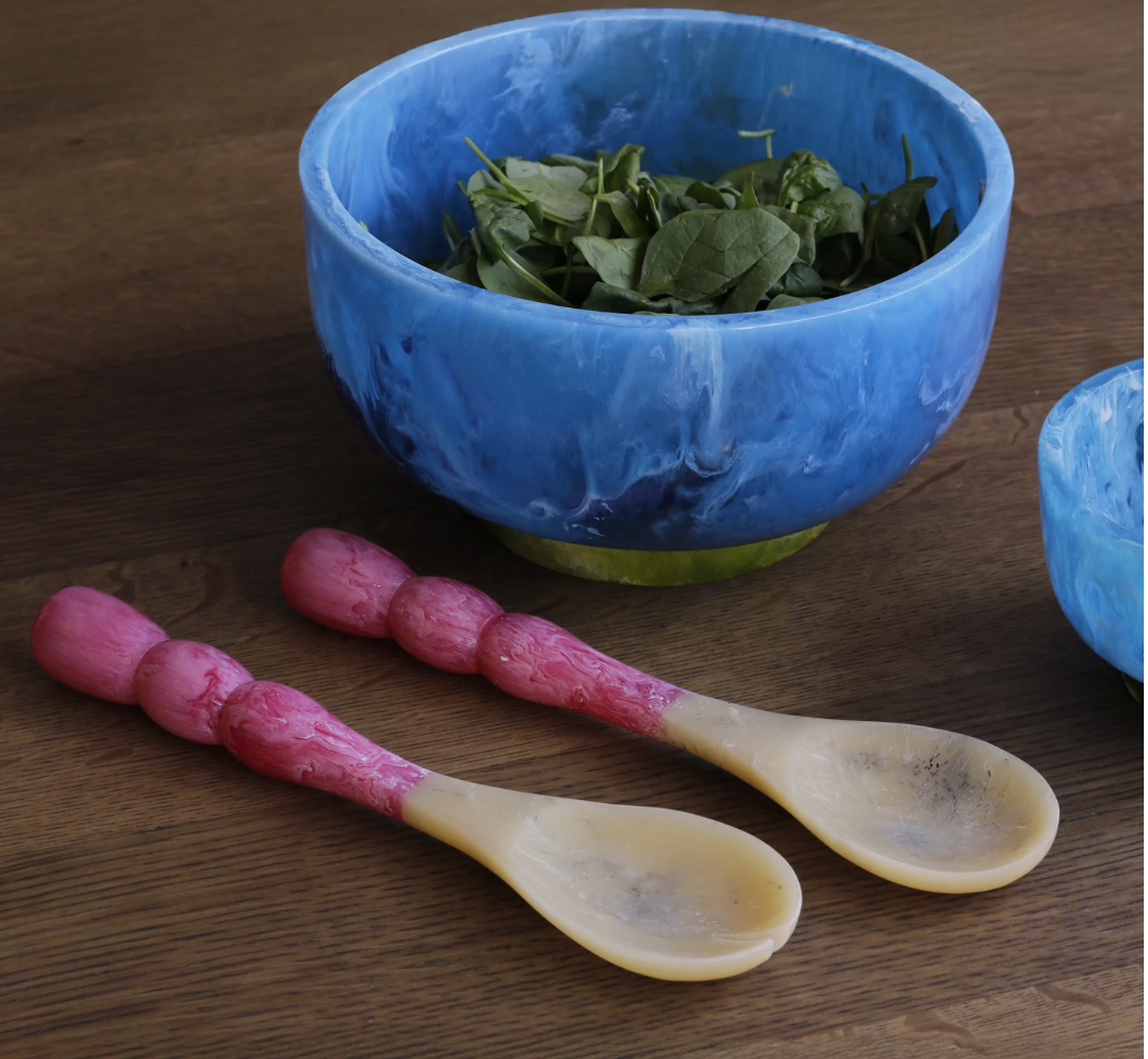 Beatriz Ball introduces translucent resin salad servers with vibrant “bubble” handles, and tines and spoons resembling natural horn. Five color combinations available. The RESIN Rio Bubble Salad Servers (Green) are perfect for serving salads, indoors or outdoors. Make a great gift.