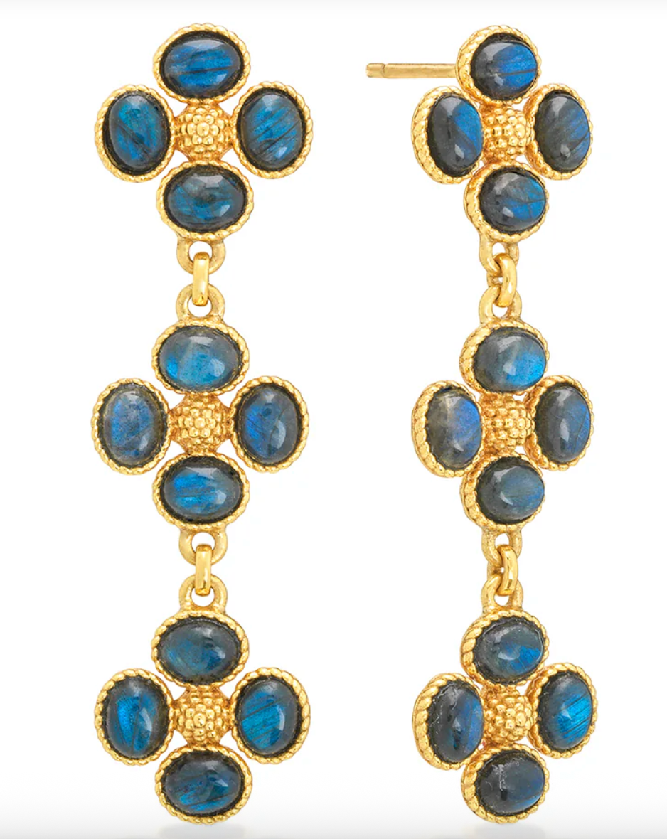 A trio of clovers descend in linear fashion for an effect that’s equally streamlined and romantic. Made with luminous orbs of blue labradorite gemstones with golden berry centers, this set brings femininity and a little luck to carry with you wherever you go.