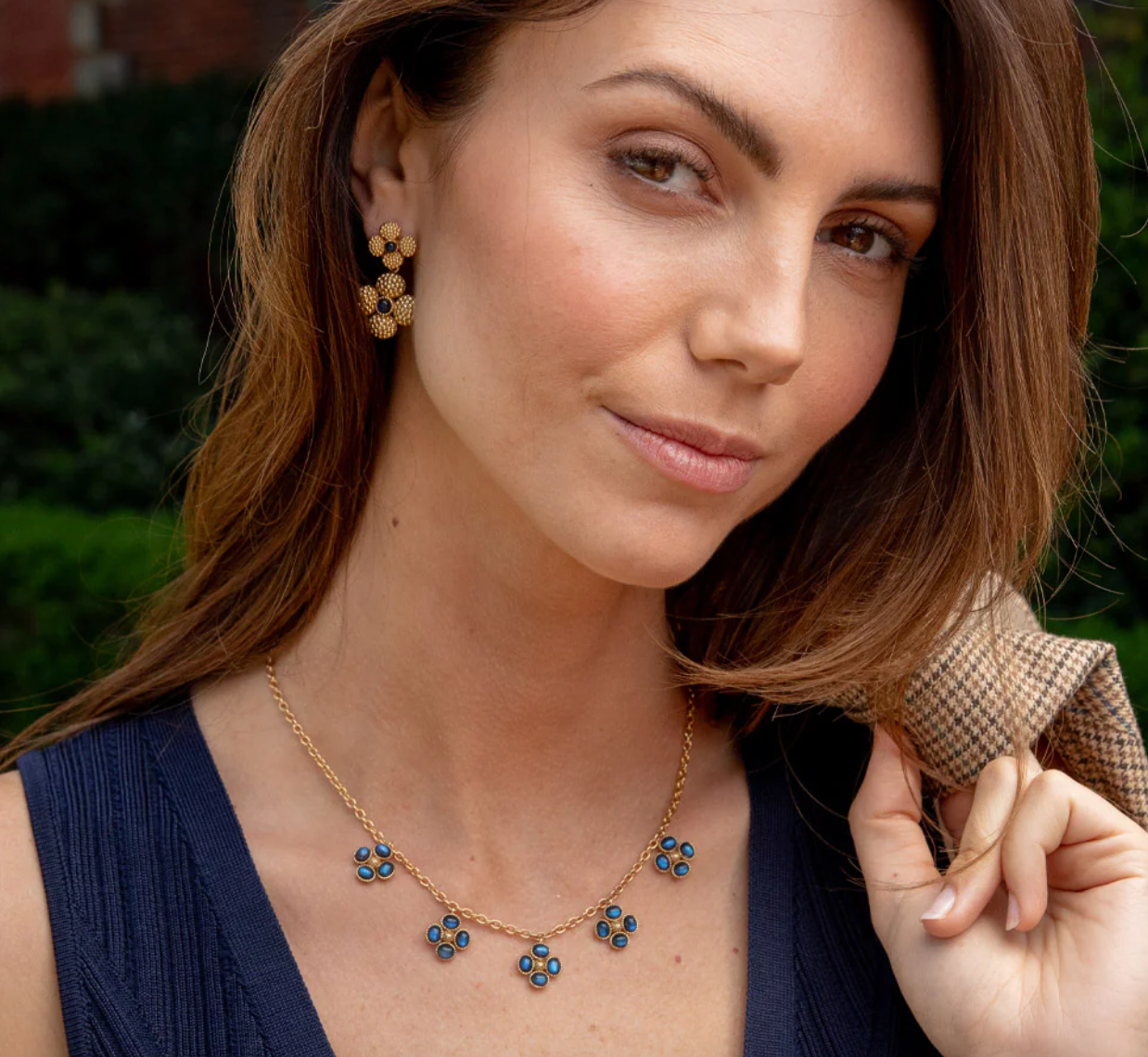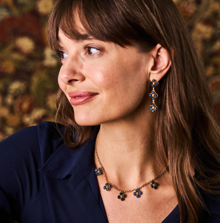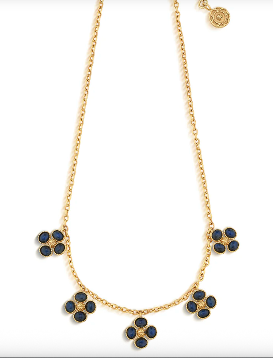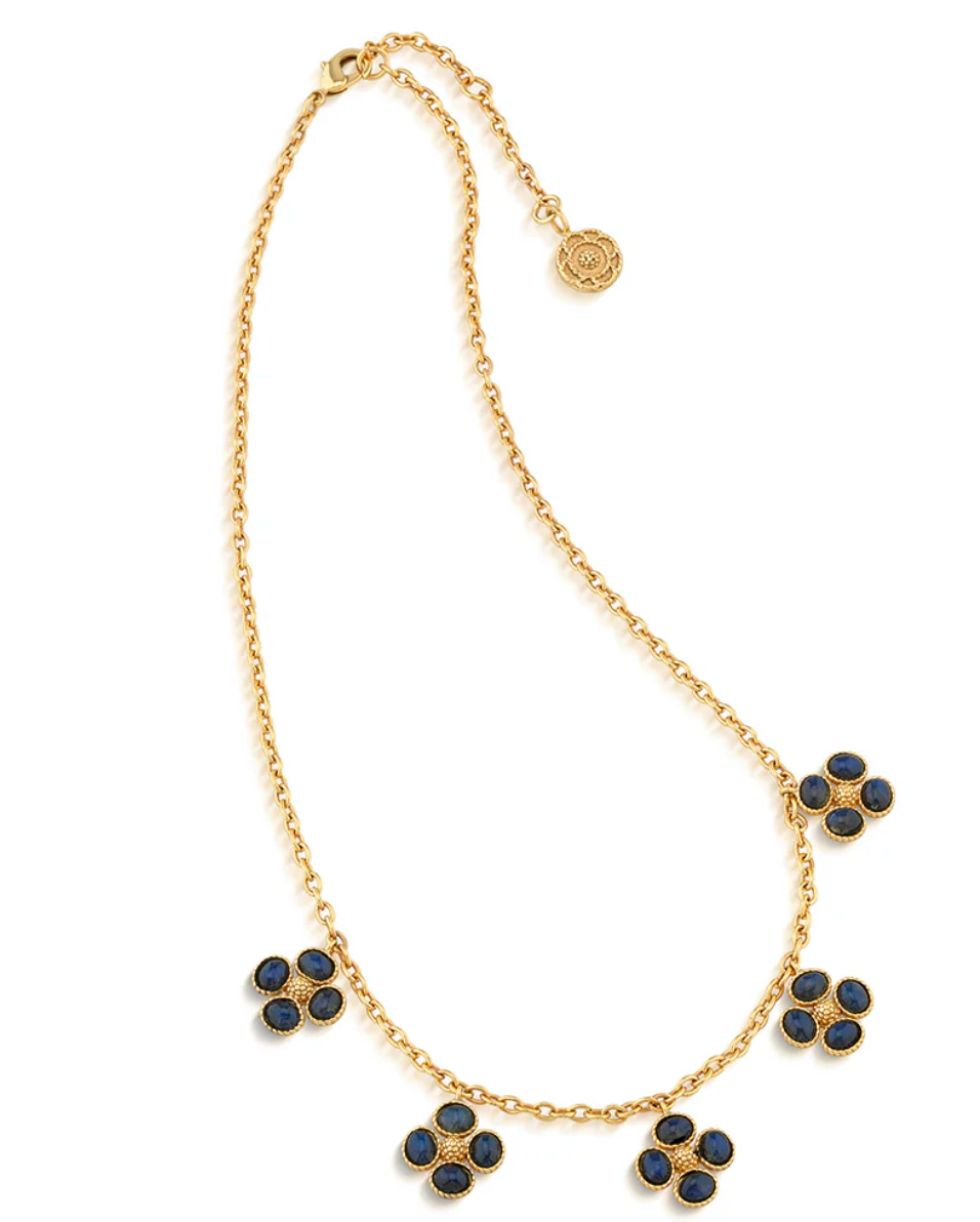 For everlasting luck, wear this dainty necklace chain interspersed with clovers of luminous blue labradorite gemstones trimmed with intricate golden detailing for an effect that’s stunning yet subtle.