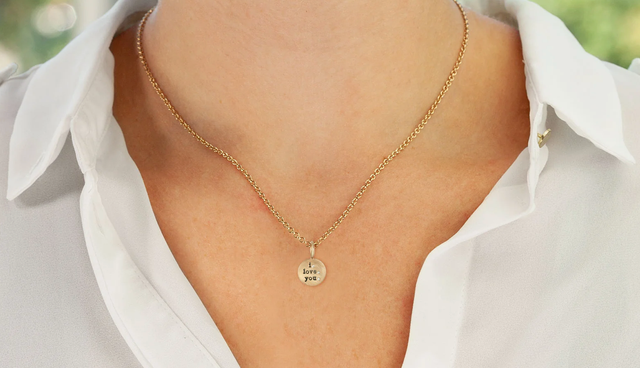 Mini yellow gold round charm with three 1.0mm white diamonds. Hand stamped with "I love you".
