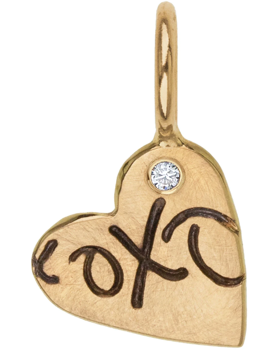 Mini yellow gold heart charm with a 1.5mm white diamond. Hand stamped with "XOXO".