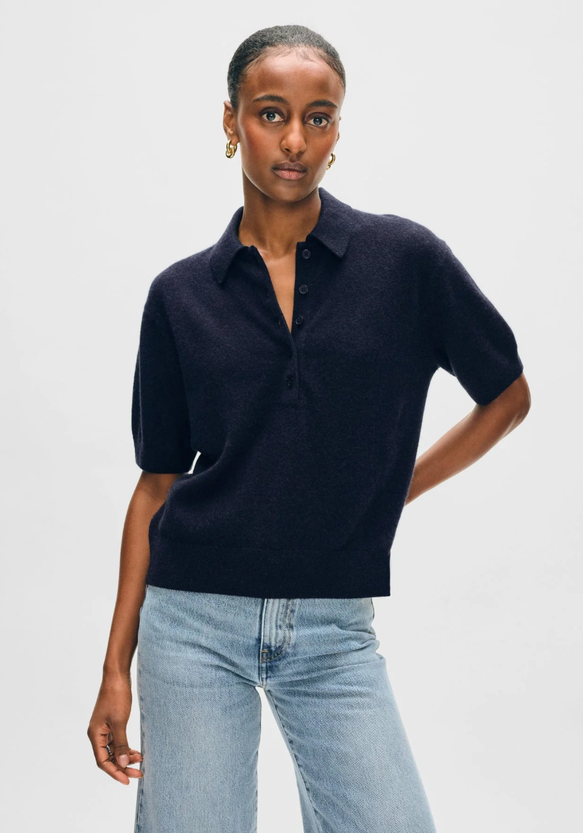 A polished essential. Crafted from 100% cashmere, this short-sleeve polo features elbow-length sleeves and covered buttons with a keyhole placket.