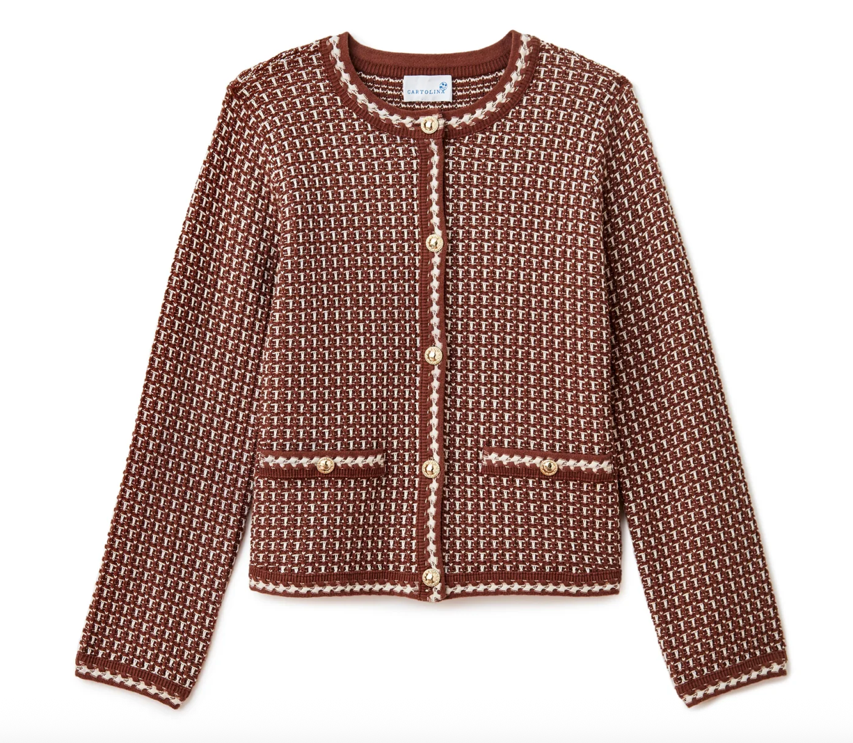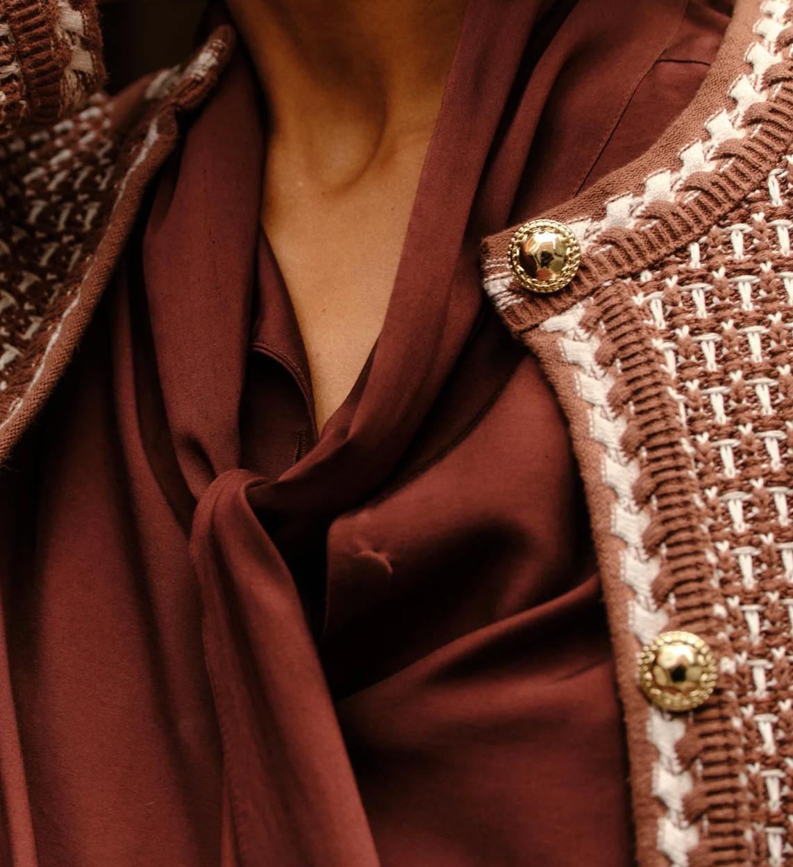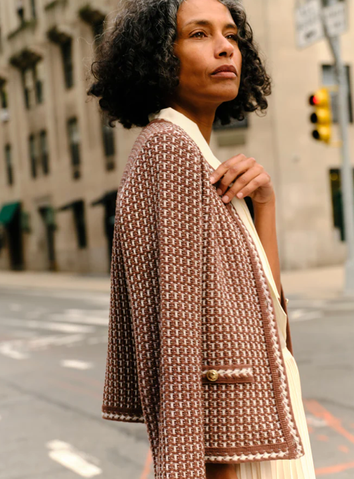 With a texture reminiscent of vintage knits, the Evelyn Cardigan carries the richness of fall in every stitch. From its braided cuffs to the gleam of gold buttons, it’s designed with intention.