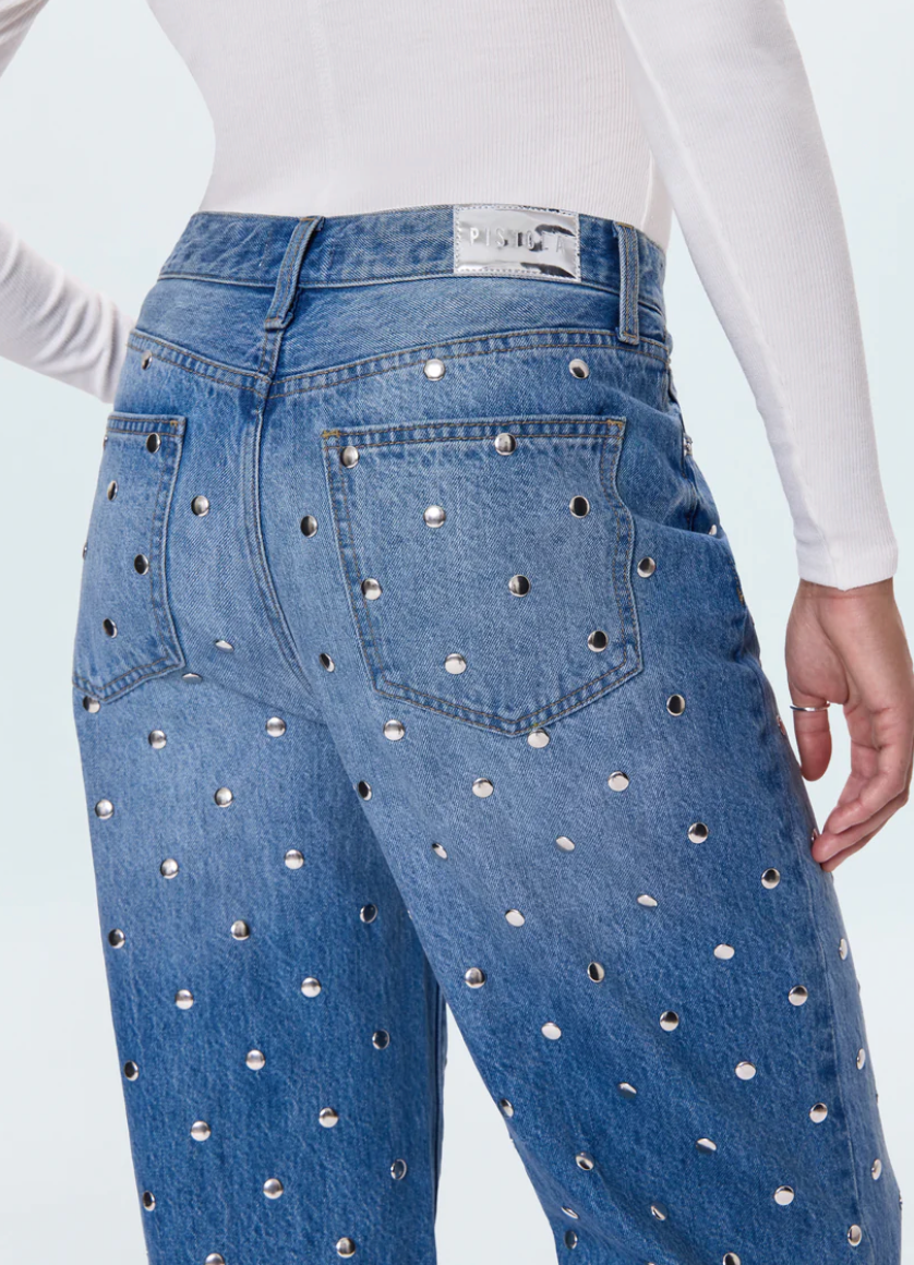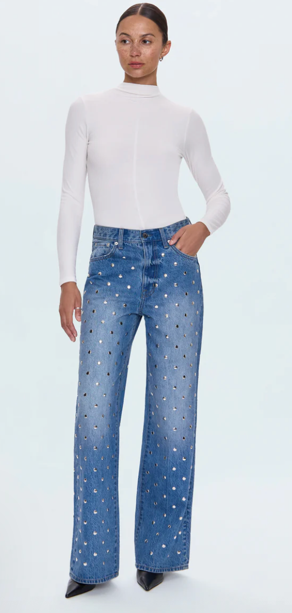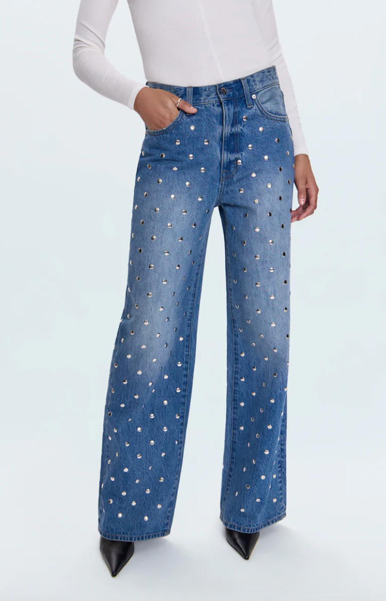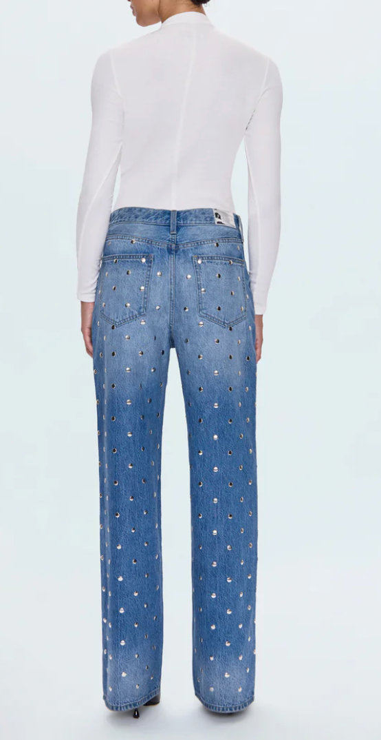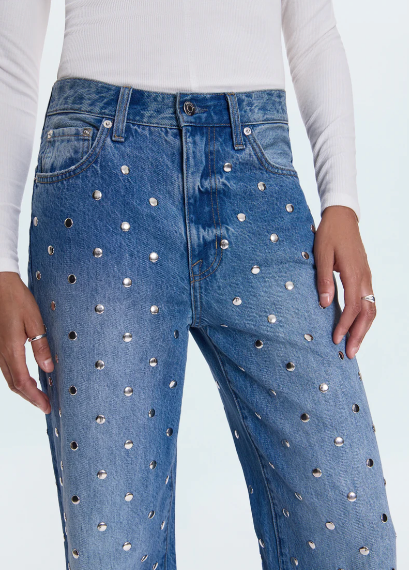 A relaxed silhouette, Hendrix features a high rise and full-length baggy leg that strikes the perfect balance between structure and slouch. Crafted from 100% cotton rigid denim, the Charmed wash showcases a medium blue tone adorned with hand-applied crystal embellishments for subtle sparkle and standout detail.