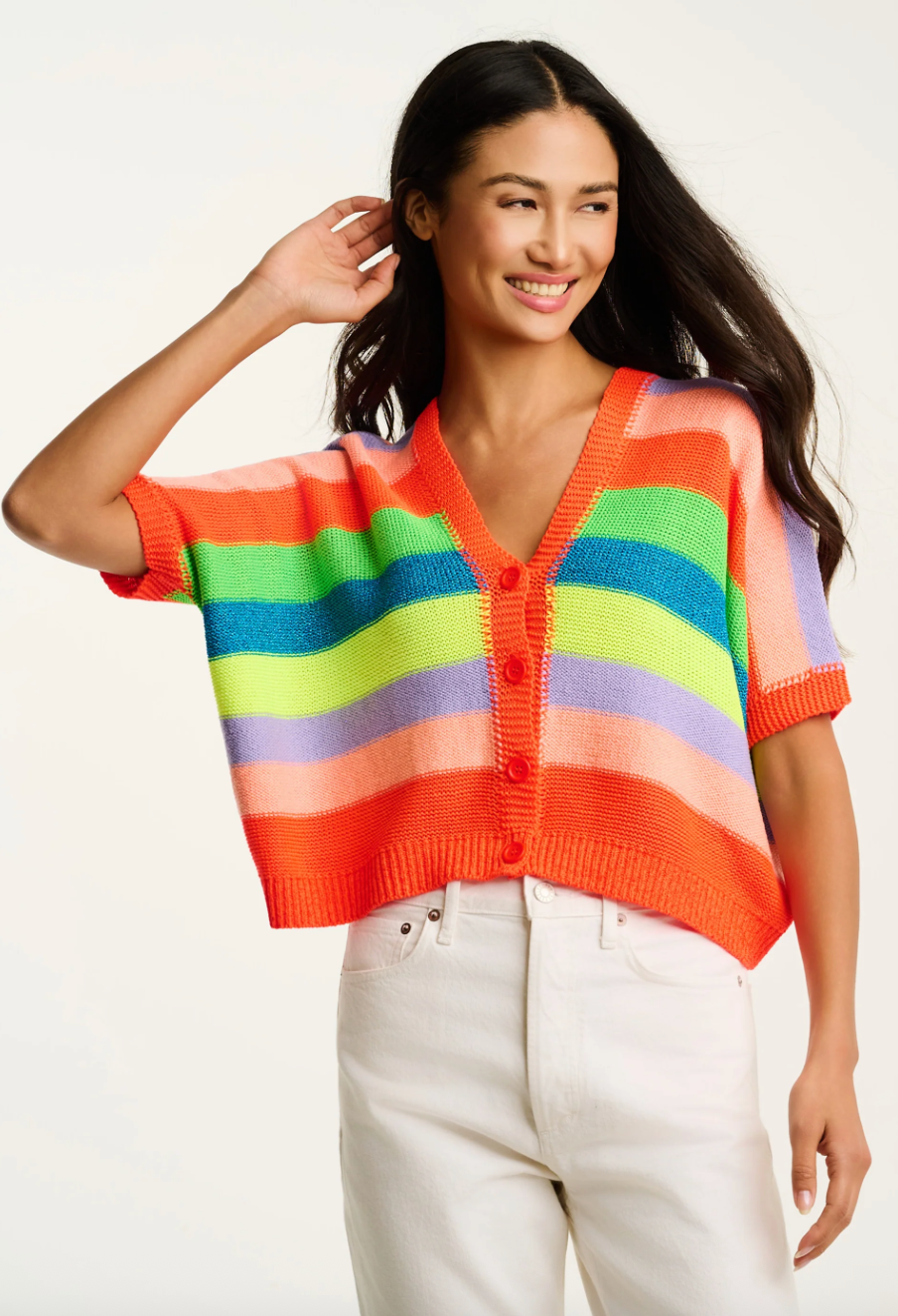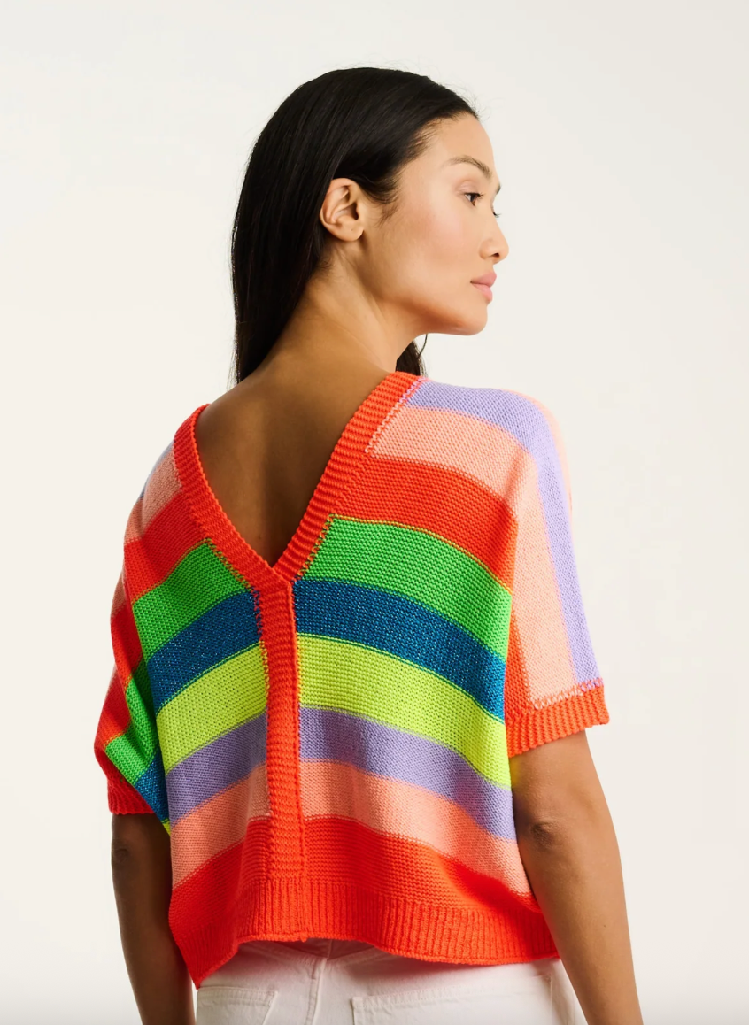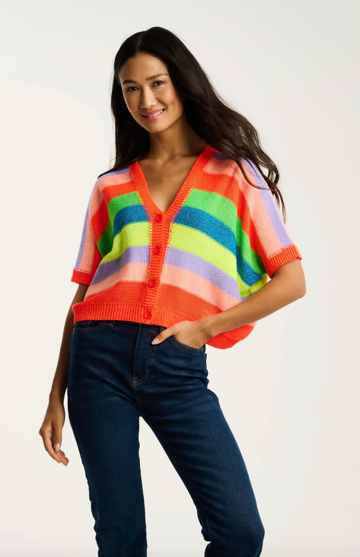 Light up your look with the Luminosa sweater from the Amore capsule.  This oversized cropped V-neck button-front bursts with multi-neon stripes — a playful mix of color and texture crafted in Italy. With its soft metallic shimmer and modern shape, it’s your go-to statement knit for breezy days and bright moods. Welcome to Primavera!