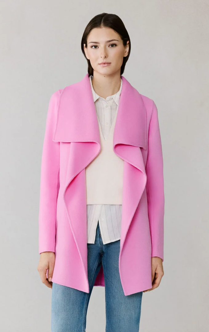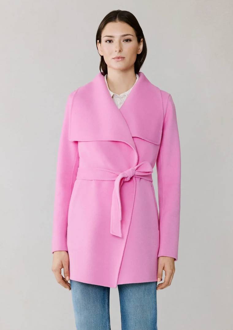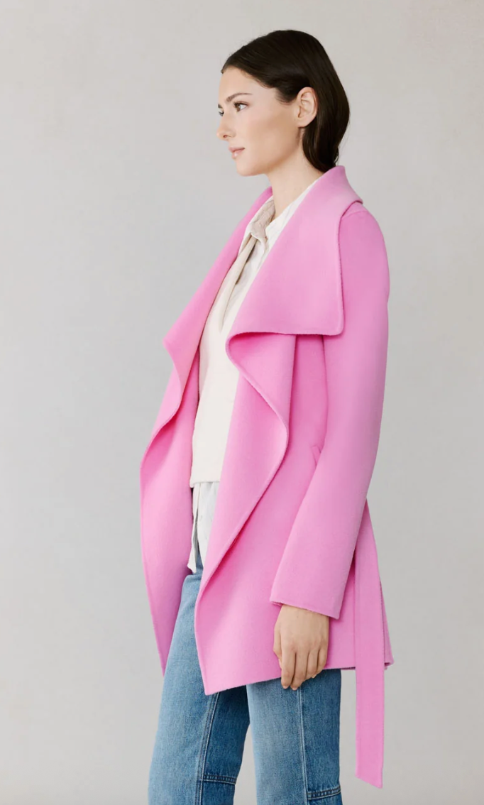 The BRIDGETTE-U by SOIA & KYO is a refined wrap coat with soft lines and tailored ease. Featuring a cascade collar, hidden button closure, and tie belt, it drapes effortlessly over layers. Made from double-face wool with hand-finished seams, it’s crafted for quiet elegance.