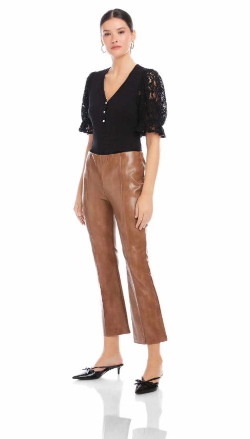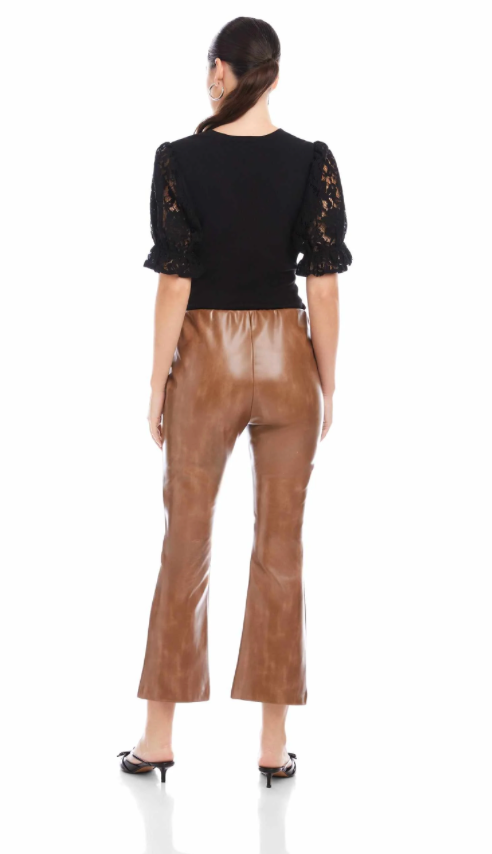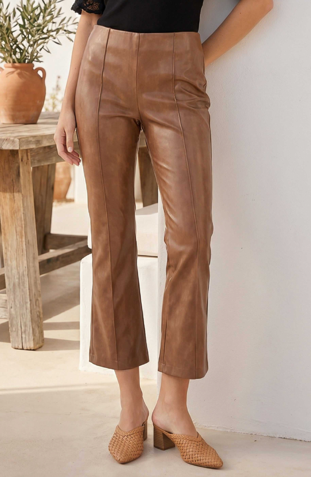 The Sigourney Pintuck Pants bring a sleek, modern look in faux leather. Designed with a smooth elastic waist for an easy pull-on fit, they feature front pintuck detailing that adds subtle structure and elongates the leg. The straight, slightly flared silhouette creates a polished finish that transitions effortlessly from day to night.